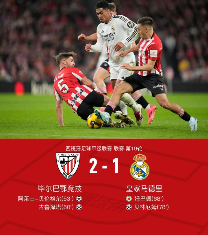 尽管皇家马德里在比赛中多次试图追平比分,但无论是姆巴佩的远射还是其他队员的努力都未能改变终局。最终,皇家马德里客场1-2不敌毕尔巴鄂竞技,遗憾结束了本轮的比赛,同时也输给了对手,让他们的前进势头受挫。